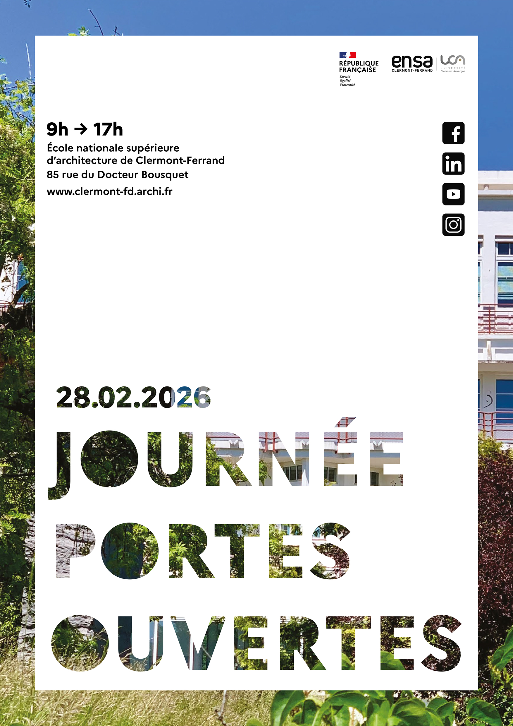 Dans le cadre des Journées Nationales de l’Architecture 2025 qui se dérouleront du 16 au 19 Octobre, l’ENSA Clermont-Ferrand sera présente sur divers temps forts tant à l’école que hors les murs